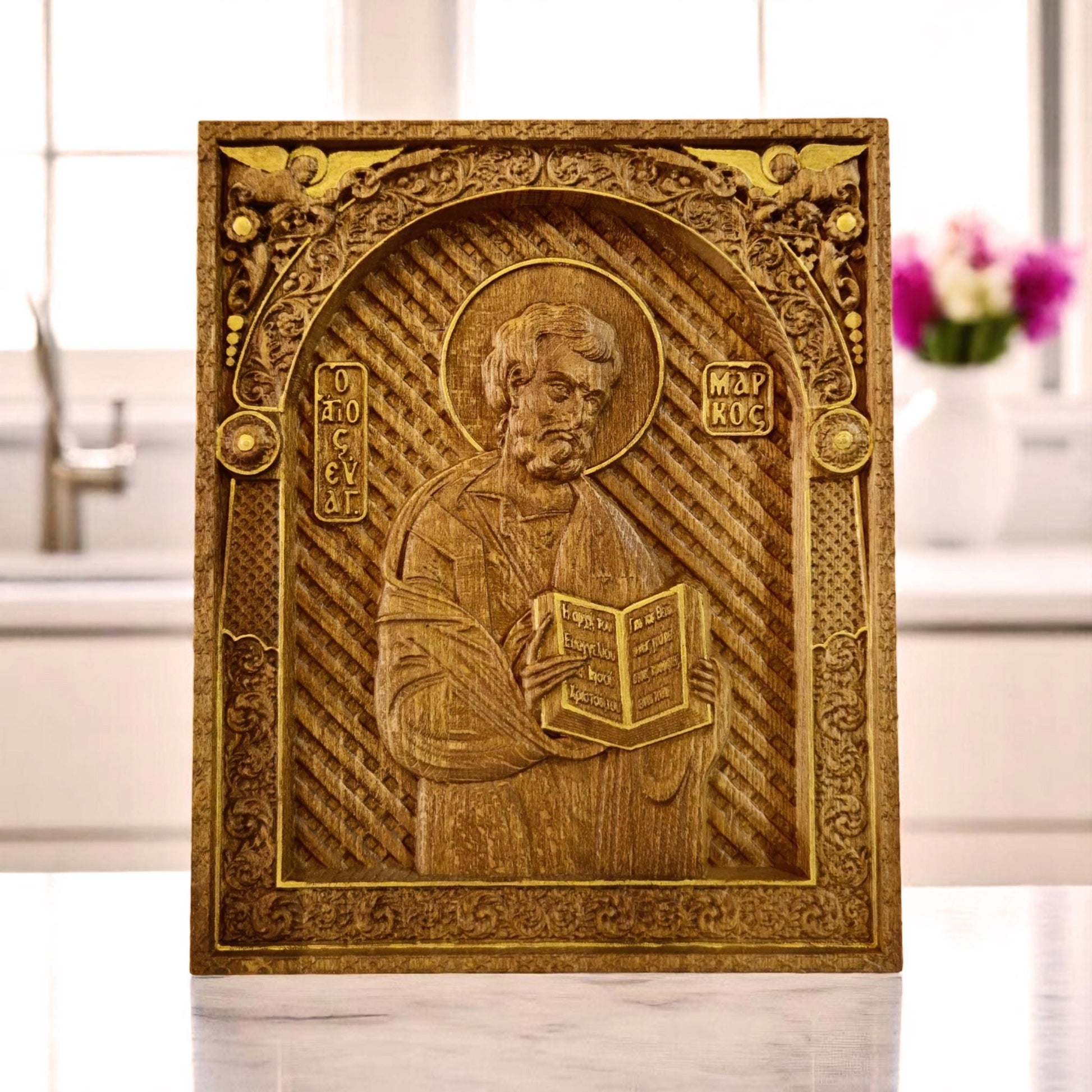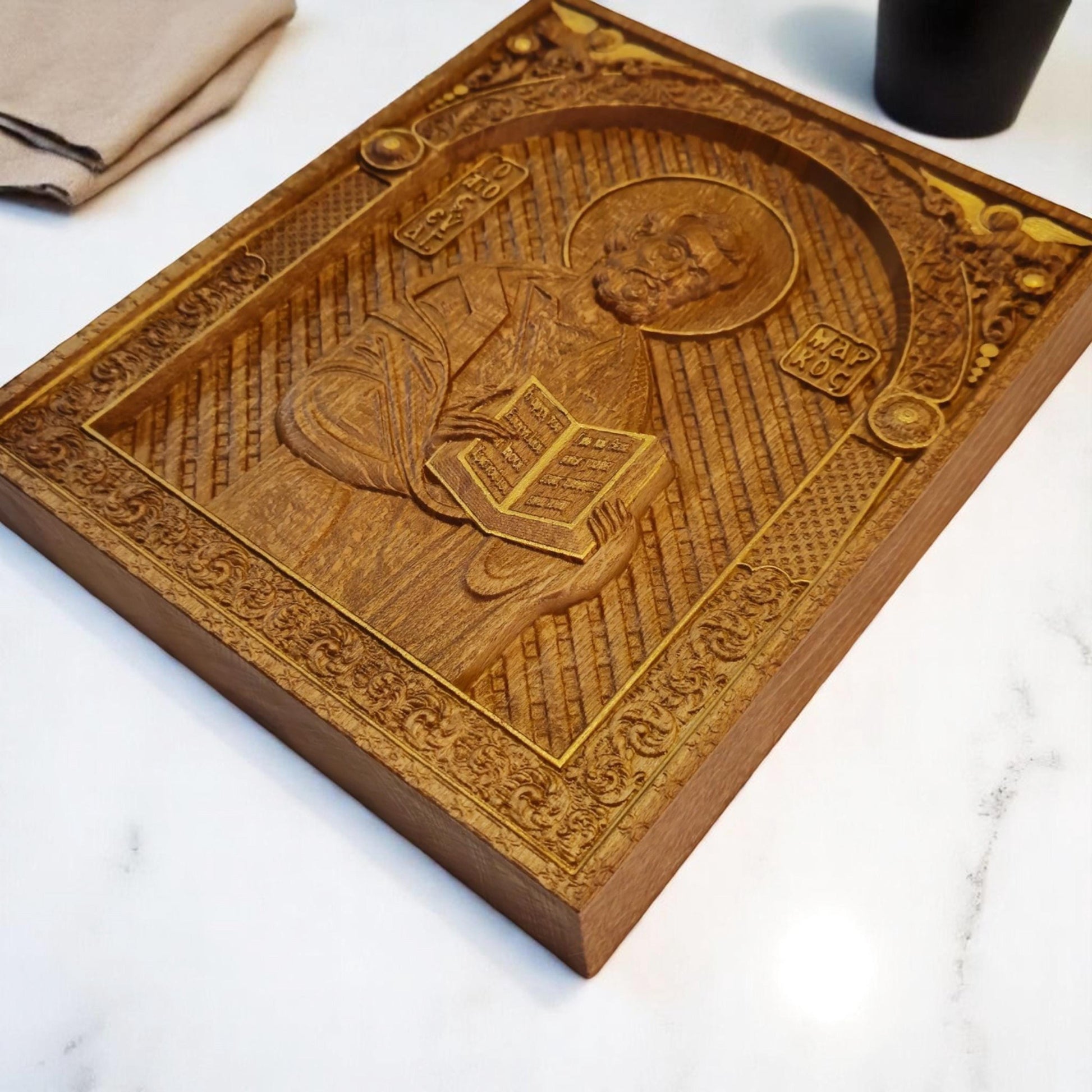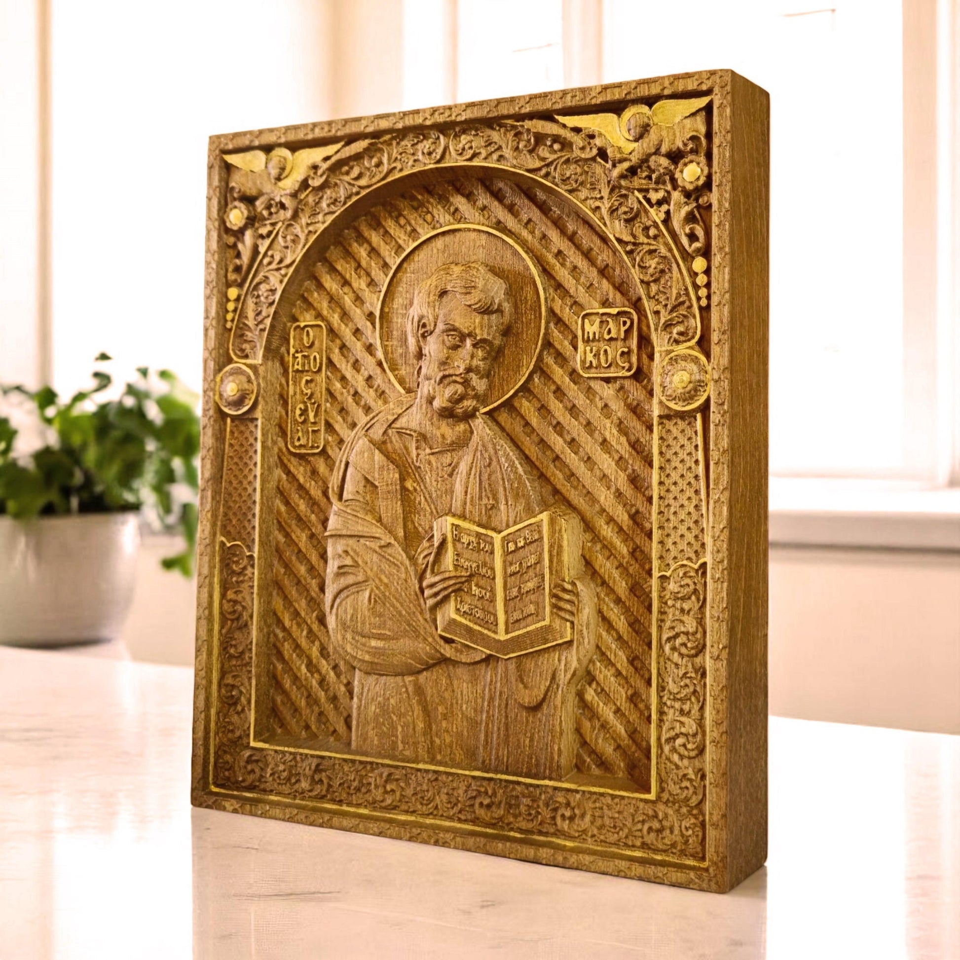 Mark the Evangelist Wooden Carved Handcrafted Christian Religious Icon. Byzantine Home Wall Art Decor Gift. Orthodox Greek Woodcarving Sculpture.