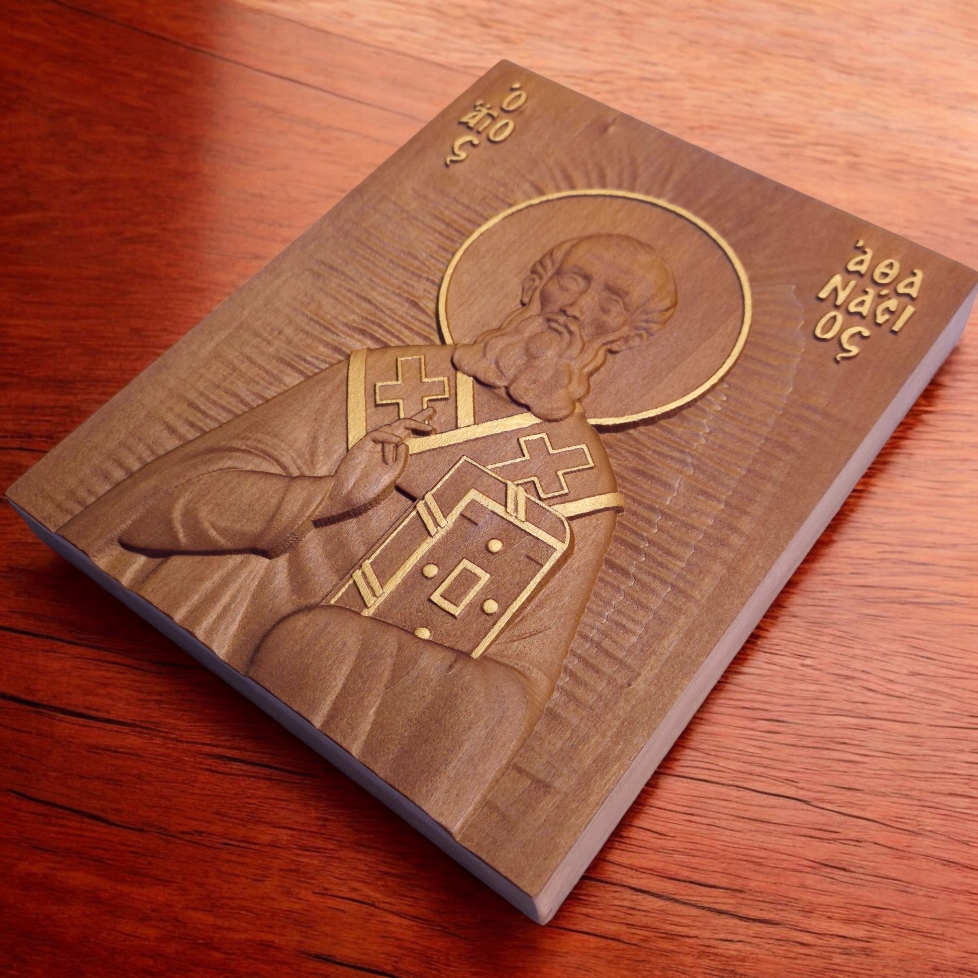 Saint Athanasius of Alexandria Wooden Carved Handcrafted Christian Religious Icon. Byzantine Home Wall Art Decor Gift. Orthodox Greek Woodcarving Sculpture.